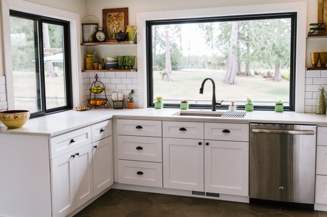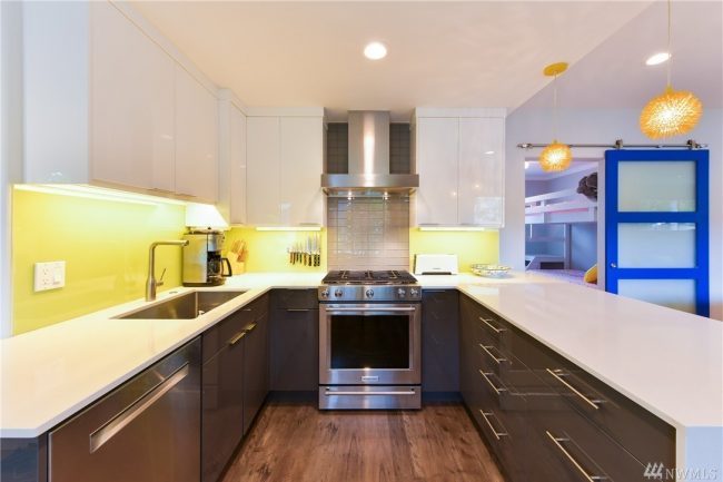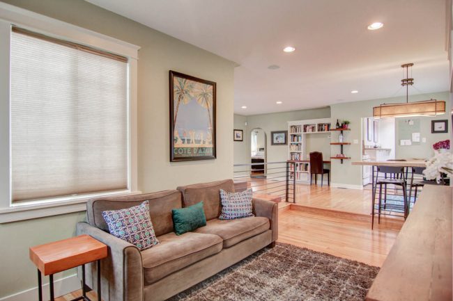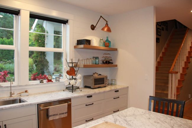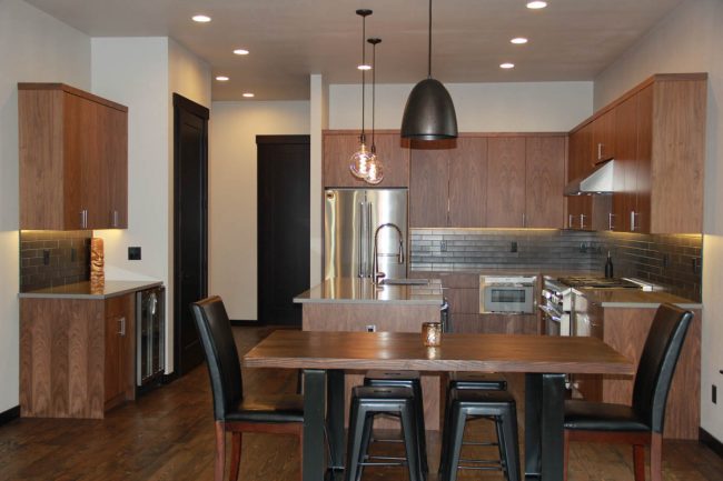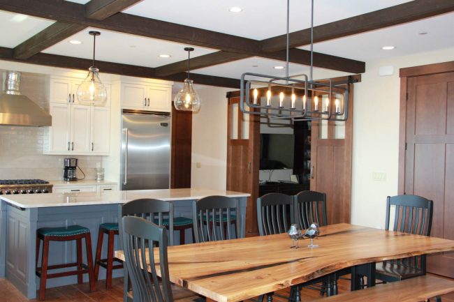 Interior Remodel This remodel reclaimed the original one car garage from a 1940s home. Designed and installed entirely by Focus Interior Finishes featuring mahogany counter tops reclaimed from train cars, bookshelves, concrete and steel tables and railings, Craftsman trim details and tiled fireplace with quartz hearth and mahogany mantle.