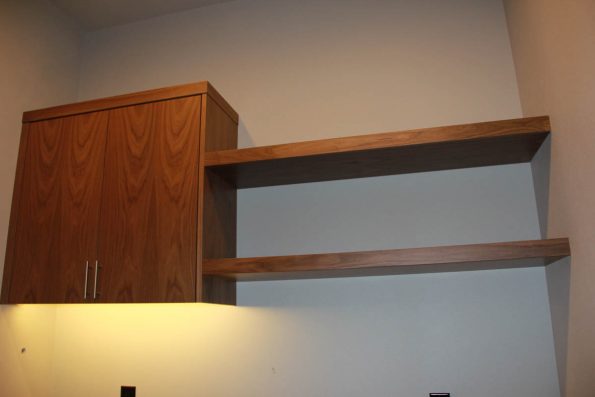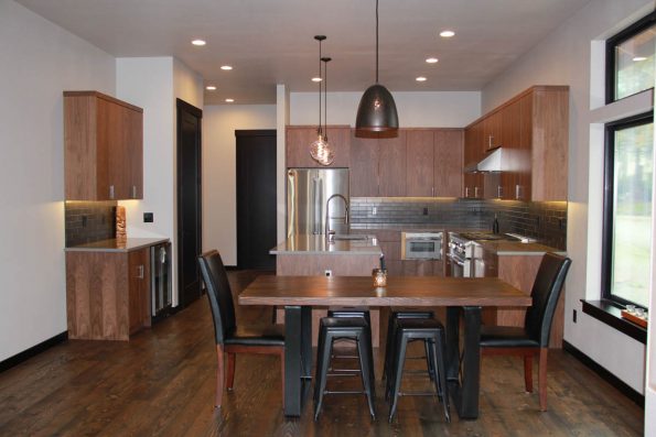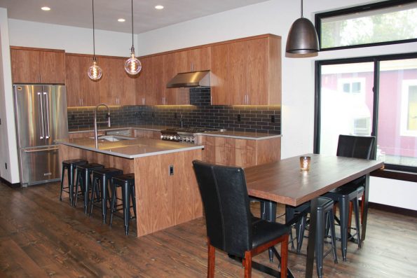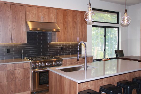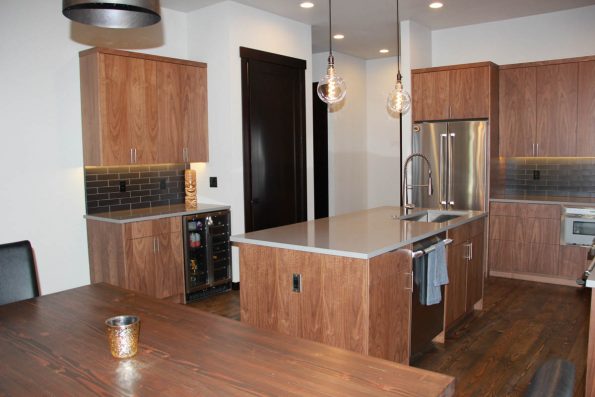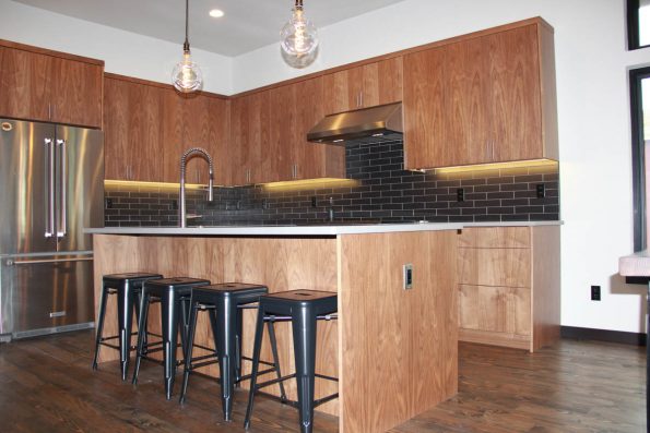 Stained walnut, black subway tile, and great lighting combine to give this kitchen its unique atmosphere